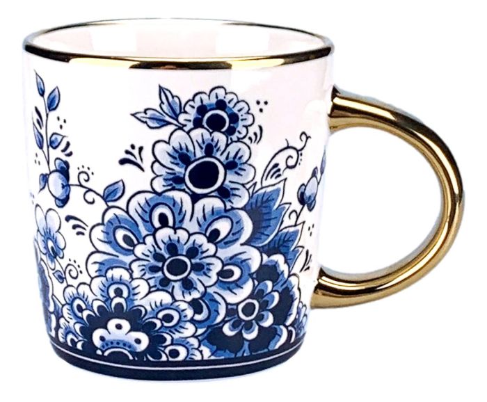 Beautiful large Delft blue colored mug decorated with a typical Dutch Delft blue flower pattern and a gold colored handle. Comes in a matching cardboard box.
