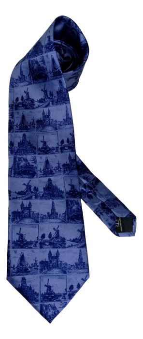 Dark blue tie with different Dutch mill, and city views repeated as tile pattern.
