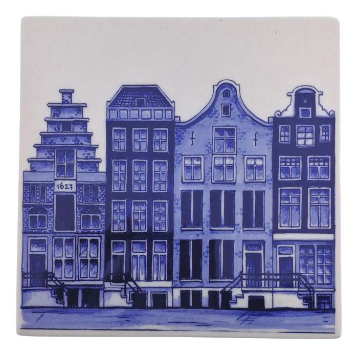 This sturdy ceramic tile is decorated with a row of Amsterdam canal houses.