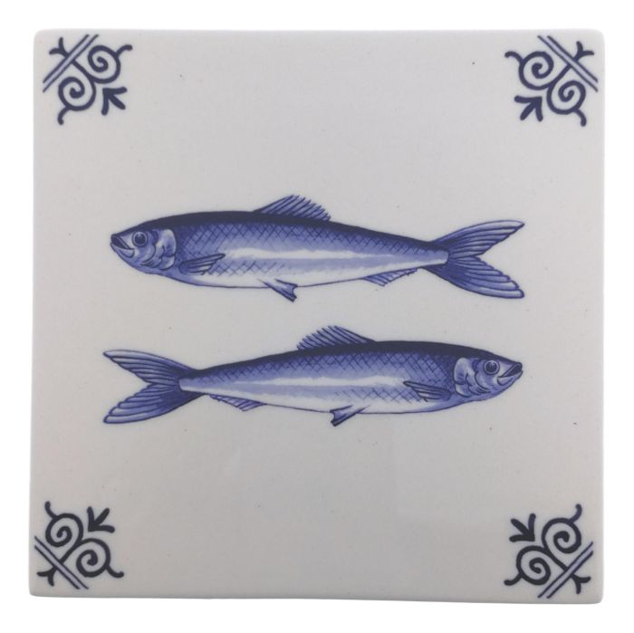 This sturdy ceramic tile is decorated with two fish in Delft Blue.