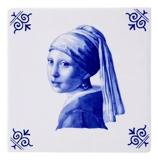 A Delft blue tile with an image of the Girl with a Pearl Earring, an iconic painting by the Dutch master painter Johannes Vermeer. This tile makes a charming decorative piece to place in your home or hang on the wall. The Girl with a Pearl Earring is one of Vermeer's most famous works. For centuries, Dutch homes have been decorated with Delft blue tiled walls.