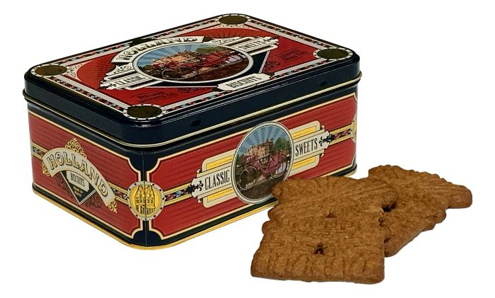 A beautiful large biscuit tin filled with delicious gingerbread cookies decorated with an art deco motif, bicycles and the text "Holland Biscuits".