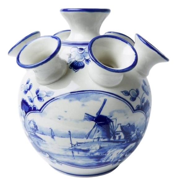 A beautiful tulip vase decorated with a mill landscape and equipped with the characteristic tulip "spouts". The spouts, of which the vase has 7, are specially for tulip vases. A beautiful colorful tulip can be placed in every nozzle.