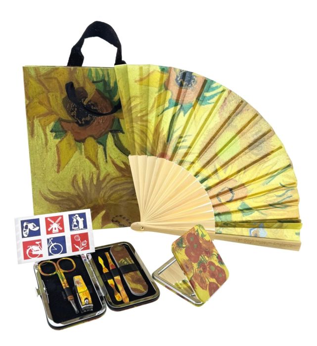 Includes an elegant hand fan, a handy make-up mirror, a compact manicure set and a matching gift bag. Perfect for lovers of art and practical accessories with a stylish look.