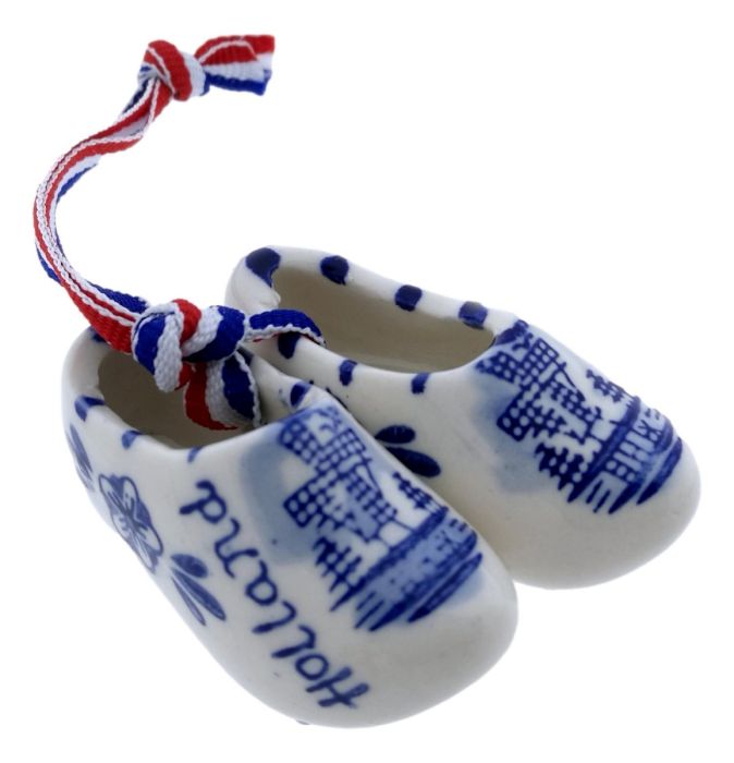 A cheerfully colored set of Delft blue souvenir clogs. These small clogs are 5 cm each and made of ceramic. Tied together with the Dutch three colors, this is a nice gift for a new acquaintance or relationship.