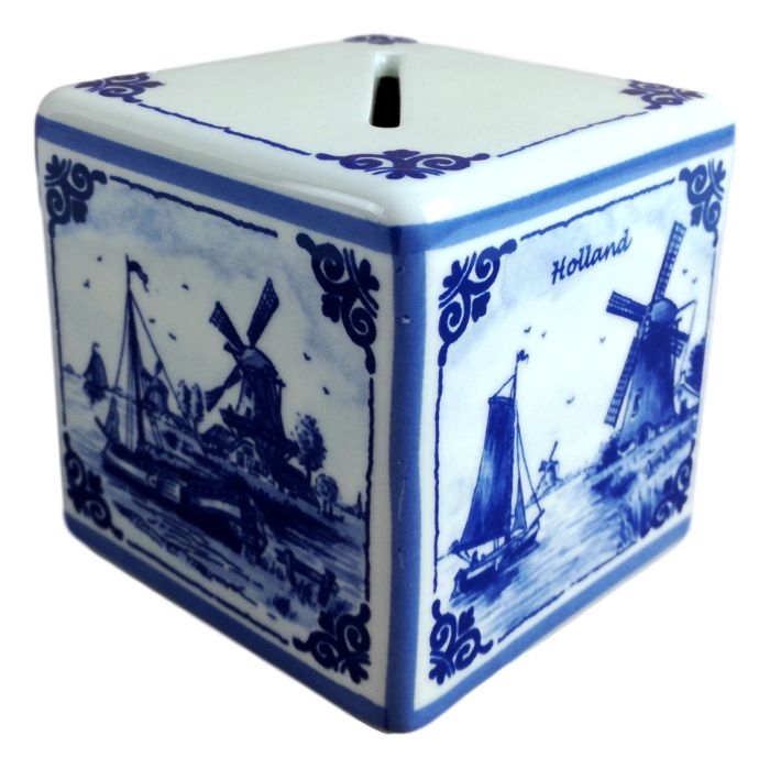 Een kleine spaarpot in de vorm van een kubus rondom versierd met verschillende Hollandse molens.