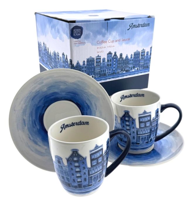 Deze elegante cadeauset bevat twee porseleinen koffiekopjes met bijpassende schotels, fraai gedecoreerd met karakteristieke Amsterdamse grachtenhuizen in klassiek Delfts blauw. De kopjes hebben een diameter van 8 cm en een hoogte van 9 cm, met een praktisch taps toelopend profiel dat comfortabel in de hand ligt.