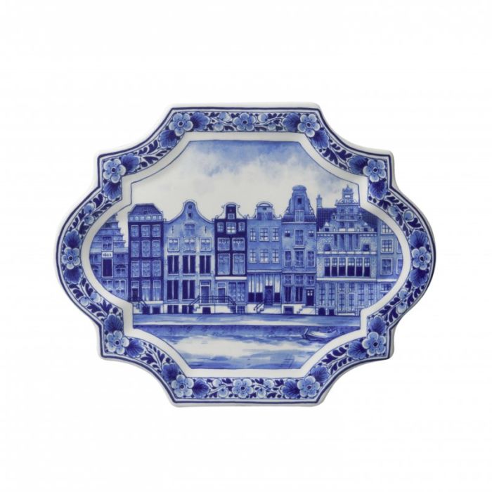 Dit middelgrote Delfts blauwe applique met licht opstaande rand is versierd met een gedetailleerde tekening van Amsterdamse grachtenhuizen. Het applique meet 22.5 cm bij 18 cm.