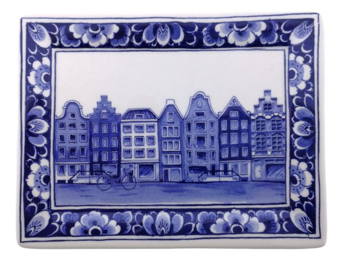 Dit kleine delfts blauwe applique of serveerschaaltje is versierd met een tekening van de Amsterdamse grachten. Gemaakt van keramiek. De afmetingen zijn 15.5 cm bij 12 cm.
