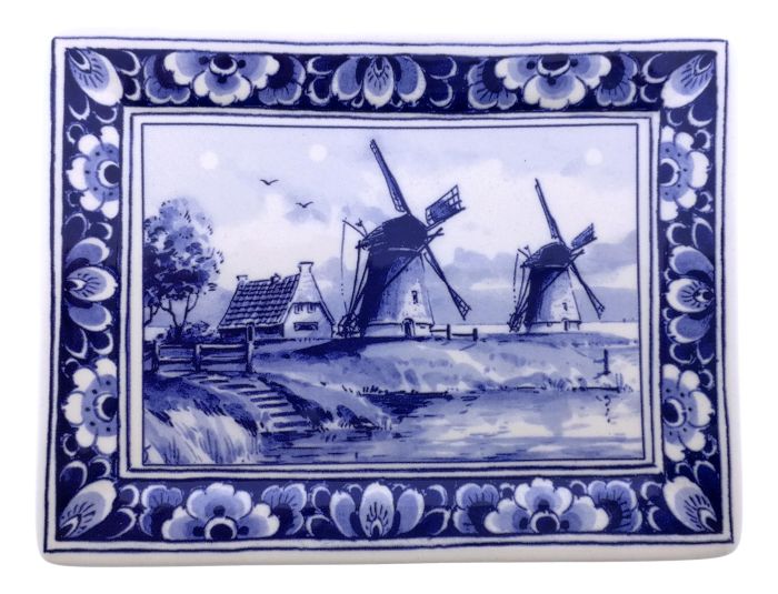 Dit kleine delfts blauwe applique of serveerschaaltje is versierd met een tekening van een Nederlands windmolen landschap.