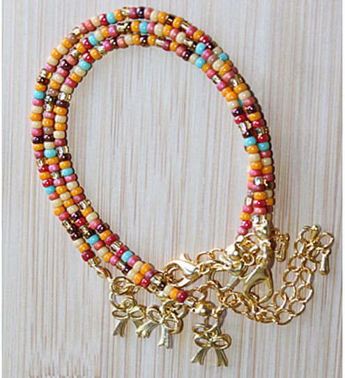 Armband 3mm Miyuki kralen Mexico in de kleuren bruin, zand, oranje, goud, rood. Geregen op soepel metaaldraad, lengte ongeveer 17cm, met een verlengketting, goudkleurige sluiting en bedel.