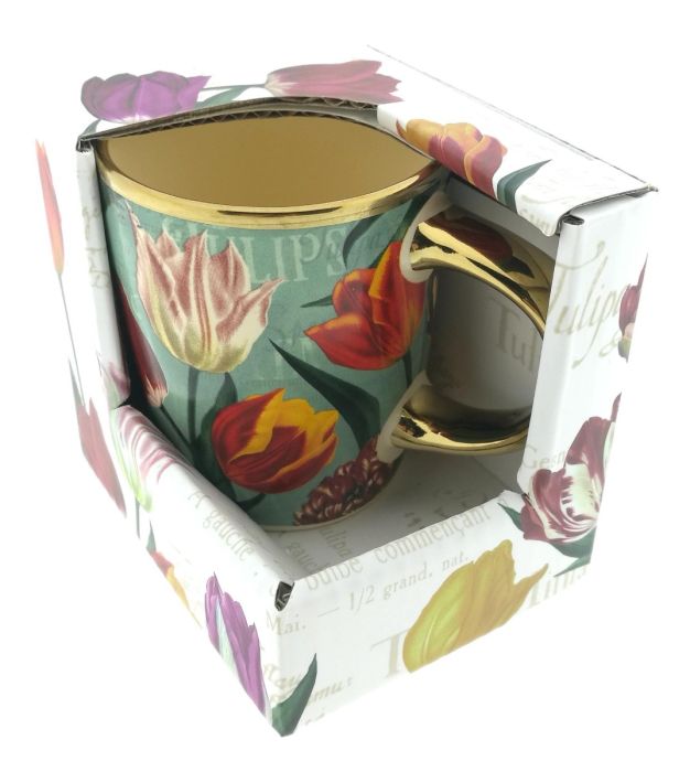 Deze mooie grote beker is gemaakt van keramiek en heeft een hoogte van 9 cm (diamater 8.5cm). De rand en handvat van de beker zijn goudkleurig en de beker zelf is groen met gekleurde tulpen. De beker wordt geleverd in een bijpassend kartonnen doosje.