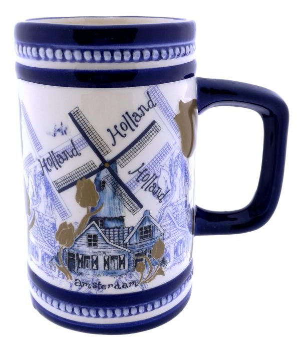 Stevige keramieken bierpul geheel versierd Hollandse molens in het Delfts blauw en daarvoor goudkleurige tulpen.