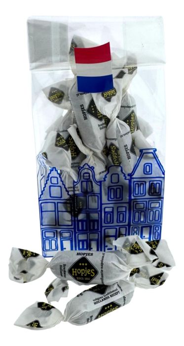Deze heerlijke Haagse Hopjes zijn een typisch Nederlandse lekkernij met een rijke koffiesmaak en een lichte karamelsmaak. Ze zijn perfect om cadeau te geven of zelf van te genieten bij een kopje koffie of thee. Het charmante blauwe zakje met grachtenpandjes maakt het een leuk souvenir of geschenk voor liefhebbers van Nederlandse snoepjes.