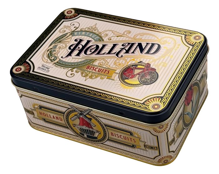 De perfecte traktatie voor de feestdagen. Dit prachtige speculaas blik is gevuld met 380 gram heerlijke, verse speculaas koekjes. De koekjes zijn versierd met een elegant art deco motief en de tekst "Holland Biscuits".
