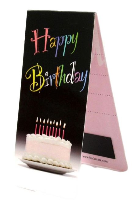 Boekenlegger met een vrolijke verjaardagstaart en de tekst "Happy Birthday".
