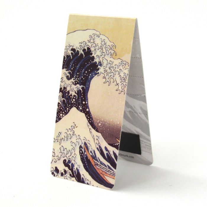 Boekenlegger. Een hoge golf, op het punt van omslaan, in een woelige zee met drie roeibootjes, de golven trotserend; op de achtergrond de berg Fuji. Dit is "The Great Wave off Kanakawa", een van Japans meest iconische werken. Gedrukt op papier van een Japanse houtprint uit 1829-32.