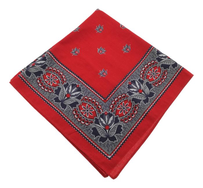 Deze veelzijdige, oud-Hollandse rode boerenzakdoek is een authentiek accessoire dat nog steeds erg populair is. Met opvallende rozen in de hoeken en gestileerde tulpen in het midden, is deze zakdoek een lust voor het oog.