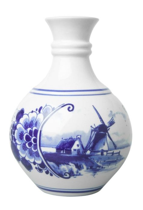 Deze mooie keramieken vaas is versierd met een Delfts blauwe gekleurde molenlandschap en er zijn ook traditionele schilderingen van bloemen te zien. Door het gebruik van verschillende tinten blauw, creëert dit diepte in de schildering van de vaas.
