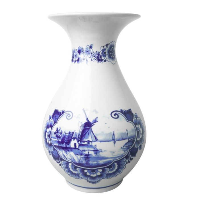 Deze mooie keramieken vaas is versierd met een Delfts blauwe gekleurde molenlandschap en verschillende bloemenpatronen. Door het gebruik van verschillende tinten blauw, creëert dit diepte in de schildering van de vaas.