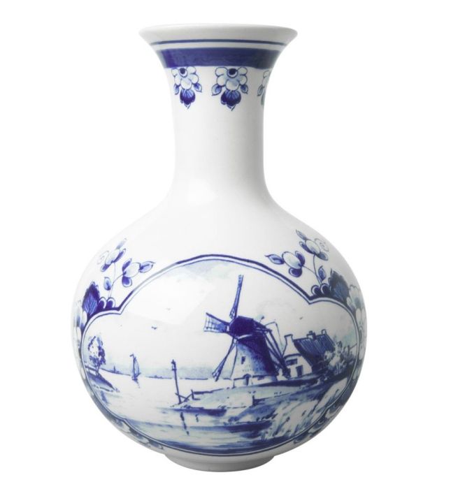 Deze buikvaas combineert traditionele oer Nederlandse patronen en schilderingen met een modern uiterlijk, waardoor deze vaas erg speciaal en elegant uit ziet. De vaas is wat breder aan de boven- en onderkant. Deze mooie keramieken buikvaas is versierd met een Delfts blauwe gekleurde molenlandschap en er zijn ook traditionele schilderingen van bloemen te zien. Door het gebruik van verschillende tinten blauw, creëert dit diepte in de schildering van de vaas. Deze Delfts blauw gekleurde vaas is gemaakt van keramiek en is 20 cm hoog. Het maakt niet uit waar je de vaas zet, deze indrukwekkende vaas valt zeker op.