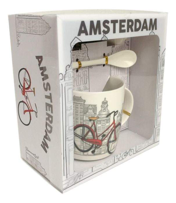 Mooie grote en stevige cadeaudoos met doorzichtig venster. In de doos bevind zich een keramische mok versierd met Amsterdamse grachtenpanden en fiets met bijpassende lepel en schotel.