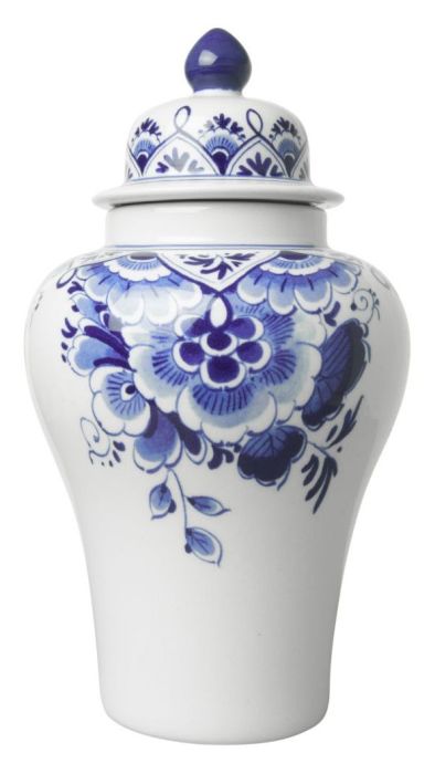 Deze hoge vaas met een deksel combineert traditionele oer Nederlandse patronen en schilderingen met een modern uiterlijk, waardoor deze vaas erg speciaal en elegant uit ziet. De vaas heeft een speciaal ontwerp; Met de deksel erop, kun je dit object in huis, kantoor, winkel zetten als een echte pronkstuk zonder dat je bloemen in hoeft te zetten. Als je de deksel eraf haalt, kun je verse snijbloemen in doen. Handig, zo'n vaas! Deze mooie en elegante keramieken vaas is versierd met Delfts blauw gekleurde traditionele bloemenpatronen. Door het gebruik van verschillende tinten blauw, creëert dit diepte in de schildering van de vaas. Deze Delfts blauw gekleurde vaas is gemaakt van keramiek en is 20 cm hoog. Het maakt niet uit waar je de vaas zet, deze indrukwekkende vaas valt zeker op.