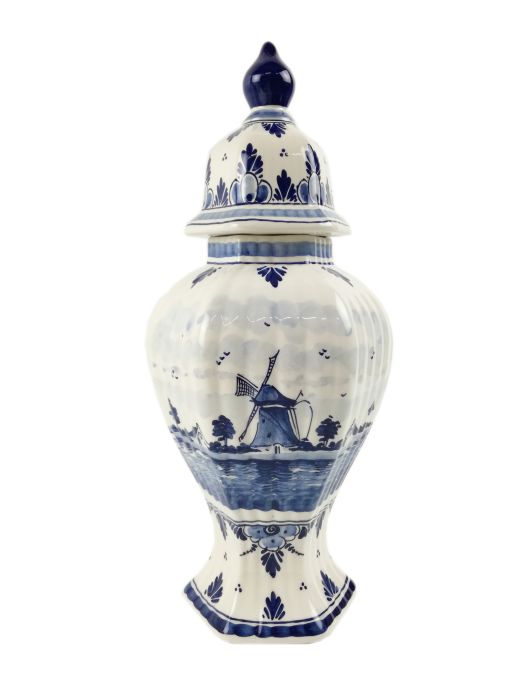 Mooie grote Delfts blauwe dekselvaas versierd met een molenlandschap aan de voorkant en bloemen aan de achterkant. De vaas bestaat uit twee delen, de vaas en de deksel.