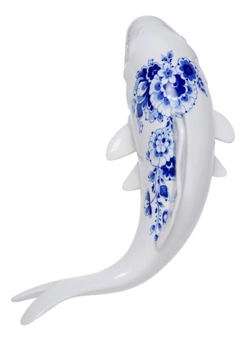 Een sierlijke porseleinwitte koi karper van keramiek om aan de muur te hangen. Deze sierlijke vissen uit oost Azie, zijn een echt statussymbool en worden gehouden om mee te pronken.