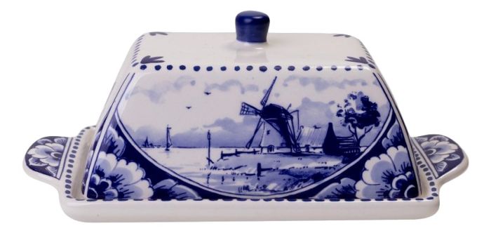 Deze mooie typisch Nederlandse botervloot is gemaakt van keramiek. De buitenkant is versierd met een tekening van een molenlandschap en bloemen.