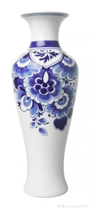 Deze slanke en lange vaas combineert traditionele oer Nederlandse patronen en schilderingen met een modern uiterlijk, waardoor deze vaas erg speciaal en elegant uit ziet. De nek en de onderkant van de vaas is wat slanker dan de rest van de vaas. Deze mooie slanke keramieken is versierd met Delfts blauw gekleurde traditionele bloemenpatronen. Door het gebruik van verschillende tinten blauw, creëert dit diepte in de schildering van de vaas. Deze slanke en lange Delfts blauw gekleurde vaas is gemaakt van keramiek en is 20 cm hoog. Het maakt niet uit waar je de vaas zet, deze indrukwekkende vaas valt zeker op.