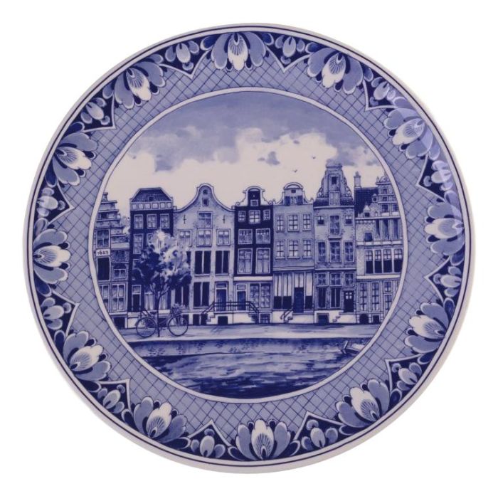 Dit Delfts blauwe wandbord is rijkelijk versierd met een tekening van de Amsterdamse grachten en een fiets.