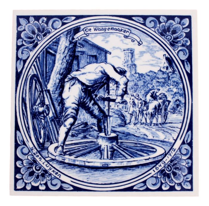 Delfts blauwe tegel met een afbeelding van een wagenmaker in de 17e eeuw. Ontworpen door Jan Luyken (Johannes Luiken), dichter, schilder en etser uit de 17e eeuw.