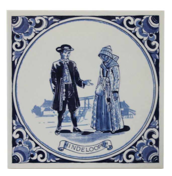 Delfts blauwe tegel met Hindelopen paar in kostuum.