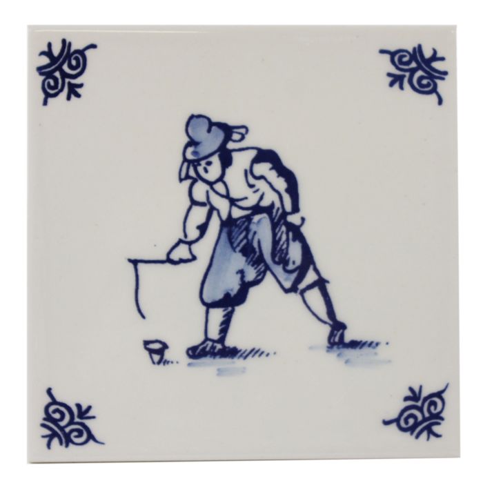 Delfts blauwe tegel met een kind spelend met een oude tol.