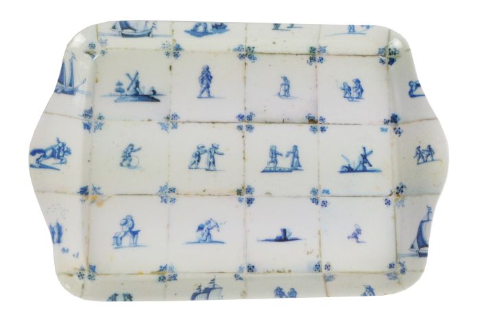 Klein dienblad met afbeelding van oudhollandse tegeltjes, diverse oud-hollandse tegels, stammend uit de periode 1620-1750.