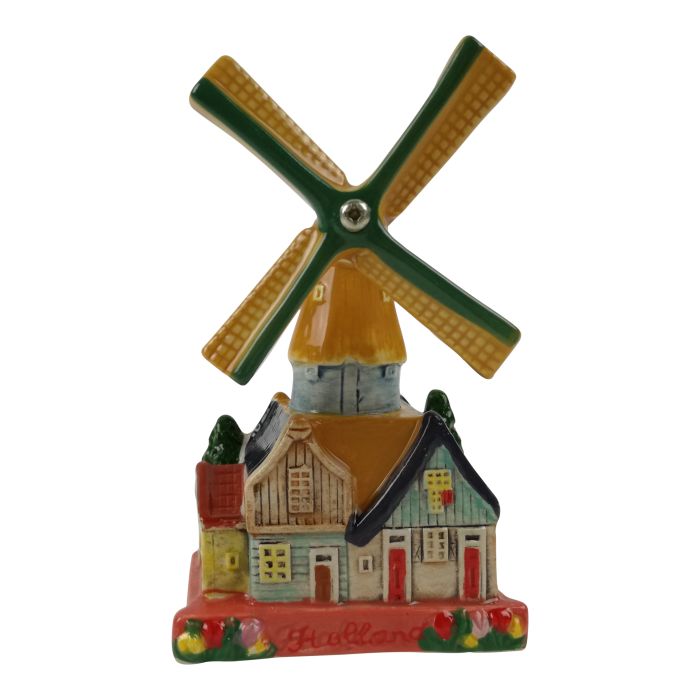 Vrolijk gekleurde kleine dorpsmolen. De molen is gemaakt van keramiek en wordt geleverd in een stevige doos. De molen is 10 cm hoog.