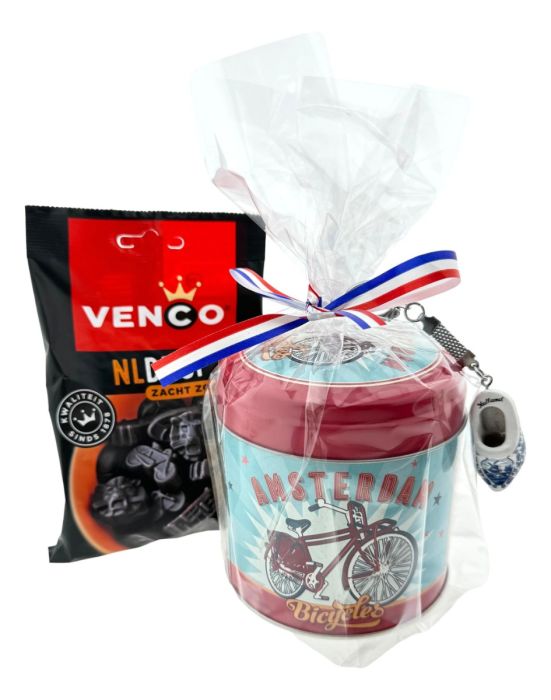 Dit mooie Amsterdam blikje wordt cadeau verpakt in een cellofaan zakje en versiert met een Nederlands lintje en een Delfts blauw houten sleutelhanger klompje.