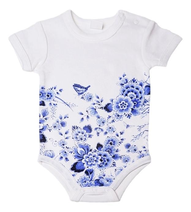 Met Delfts blauw gekleurde bloemen als illustratie, zorgt dit rompertje voor een Hollandse uitstraling.
