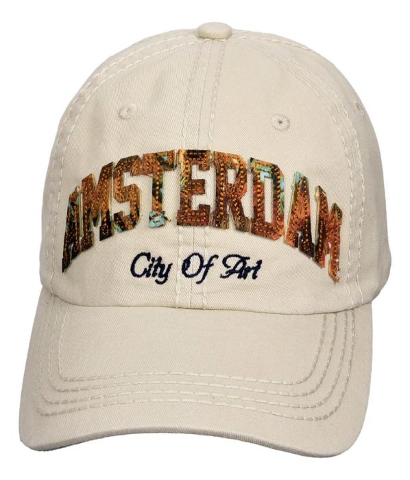 Geinspireerd door Van Gogh heeft deze Amsterdam pet de letters Amsterdam in de kleuren van zijn beroemde werk. De onderkant van de pet klep is ook versierd met de zonnebloemen.