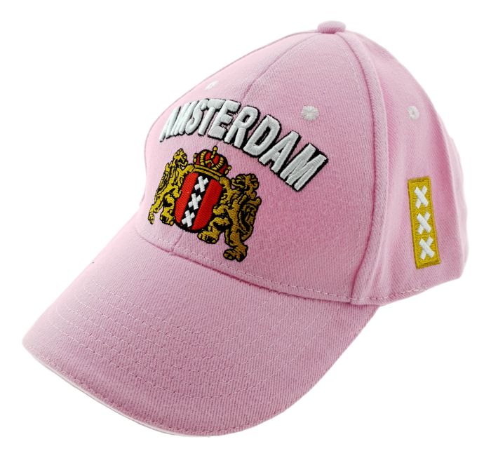 Roze pet met het wapen van Amsterdam op de voorkant, en de tekst "Amsterdam" in het wit, en de drie kruizen op de zijkant. De pet is verstelbaar en geschikt voor iedereen.