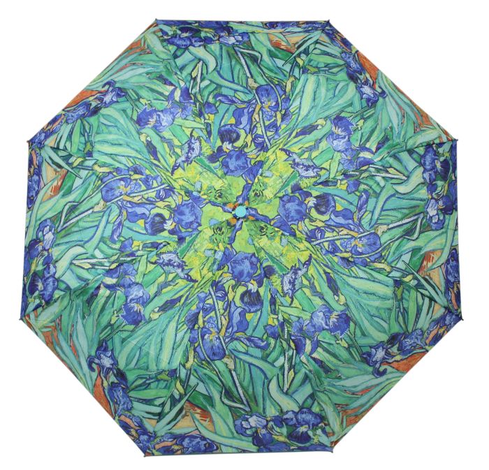 Handzame Robin Ruth paraplu kleurig versierd met het werk "Irissen" door Vincent van Gogh.