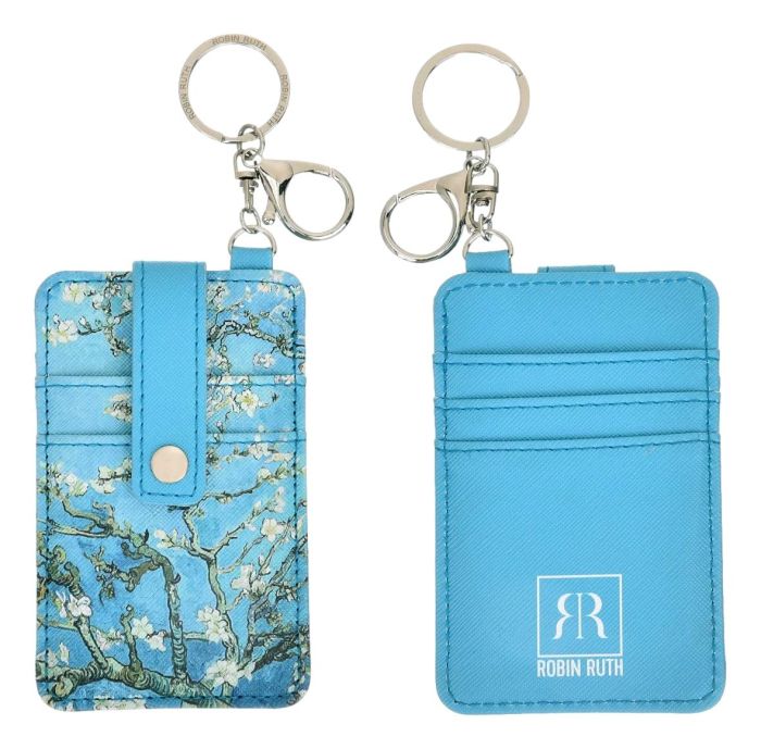 De houder heeft meerdere vakken voor pasjes en een sleutelhanger.