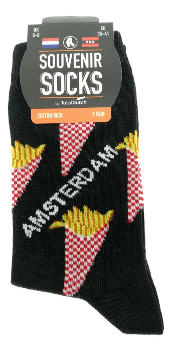 Zwarte sokken versierd met lekkere frites, en de tekst "Amsterdam"