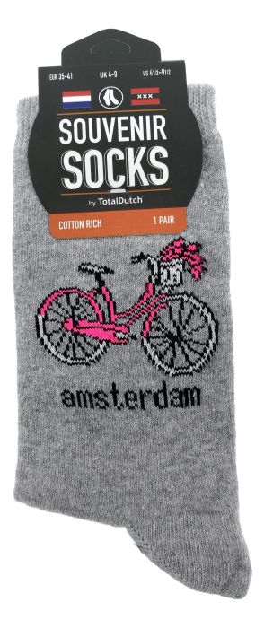 Grijze sokken versierd met een roze fiets en de tekst "Amsterdam".