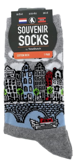 Grijze sokken versierd met gekleurde Amsterdamse grachtenhuisjes en de tekst 'Amsterdam'.