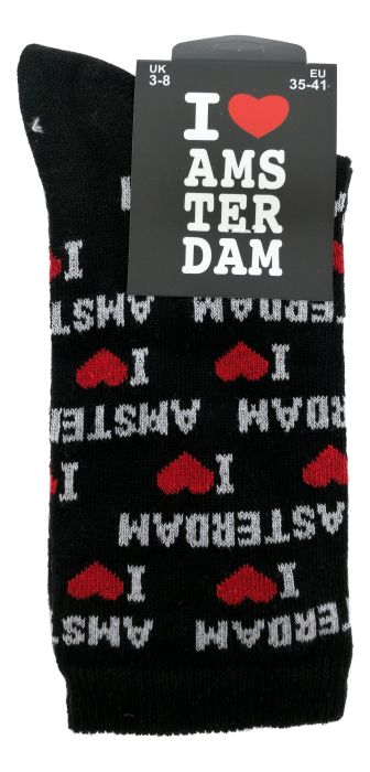 Zwarte sokken versierd met de tekst "I ❤ Amsterdam", met rode harten.