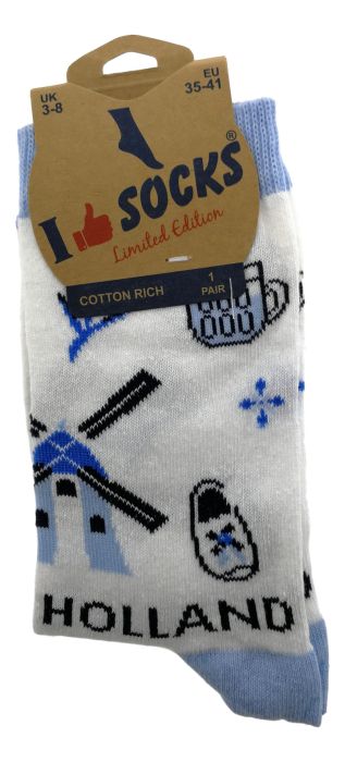 Witte sokken versierd met Delfts blauwe molens en klompen en de tekst "Holland".