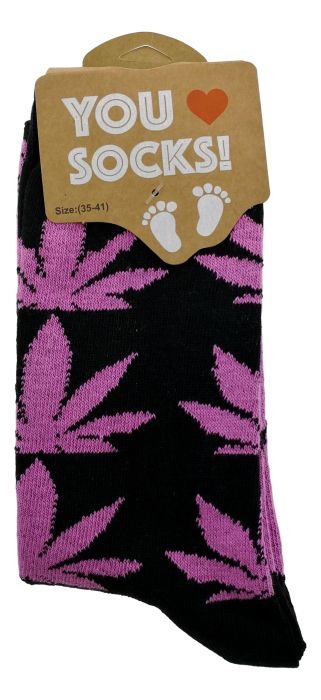 Zwart sokken versierd met vrolijk paars gekleurde wietbladen. Dit zijn dames sokken. De sokken zijn gemaakt van 80% katoen, 18% polyamide en 2% elastaan. Maat: 35-41 / UK 3-8