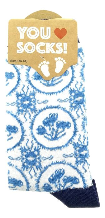 Fleur je outfit op met deze kleurige sokken. Deze dames sokken zijn versierd met Delfts blauwe bloementegels.